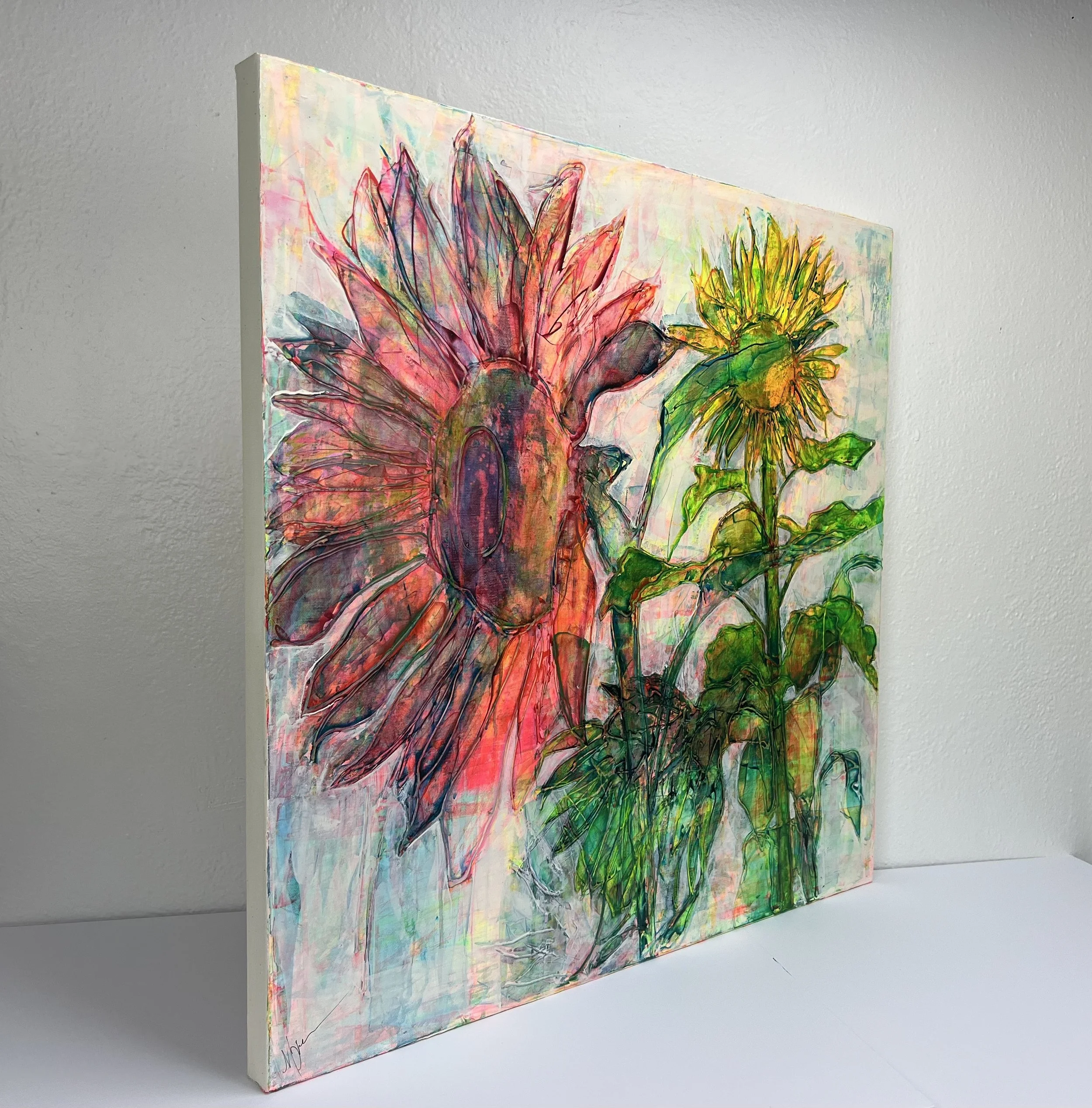A composed meditation on perspective and renewal. Inspired by the structural grace of sunflowers—upright stalks, draping leaves, light gathered at the edge of petal and shadow—this work holds two readings at once: the world you know and the one arriving. Finished with a hand-applied archival varnish that imparts a rich, oil-like depth and a quiet, luminous sheen.